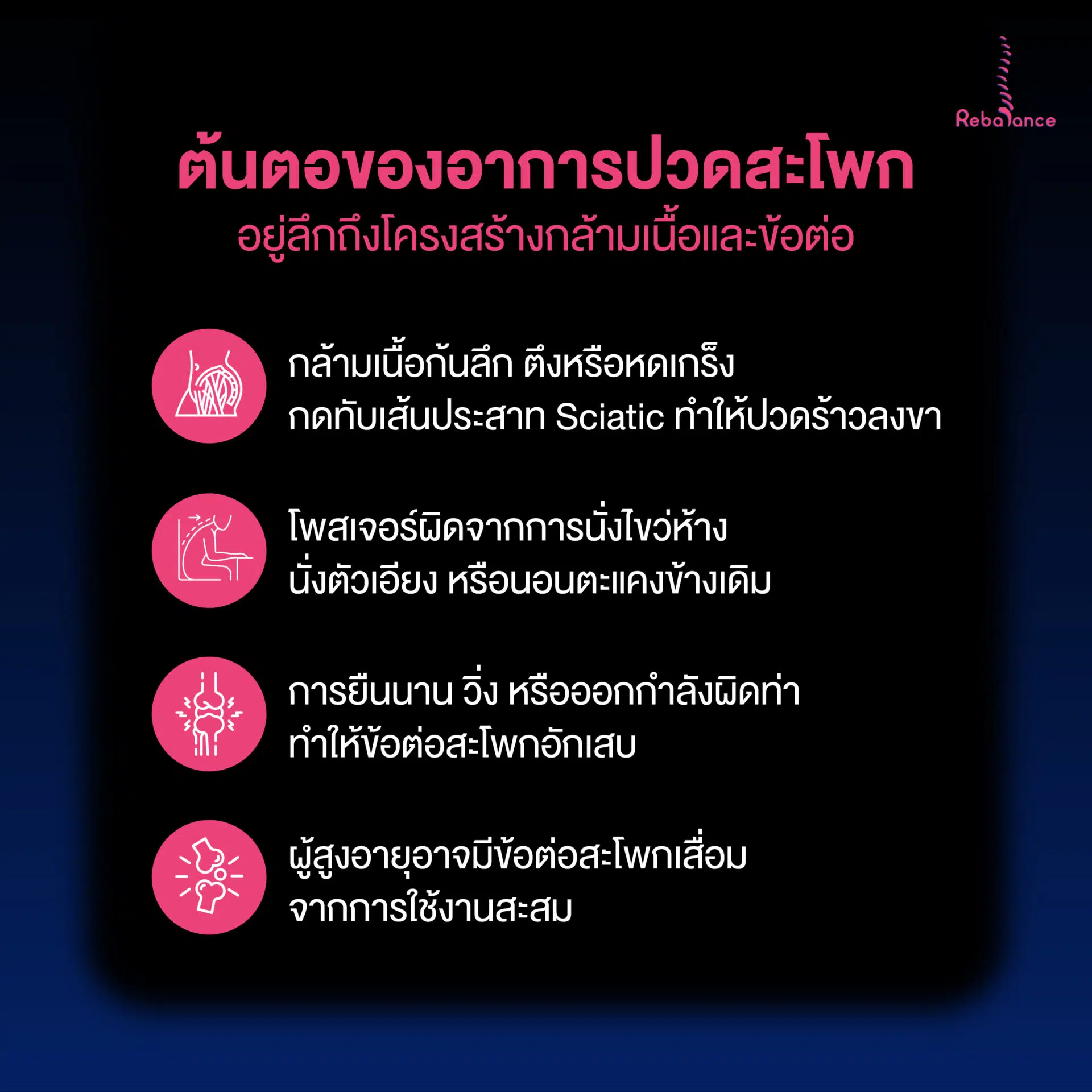 รู้ไหมว่า…สามโรคที่มักถูกสับสนมากที่สุดคือ สลักเพชรอักเสบ เส้นประสาทไซอาติกาอักเสบ และหมอนรองกระดูกทับเส้น วันนี้รีบาลานซ์จะขอแยกให้เห็นอย่างเป็นระบบว่าอาการของทั้งสามโรคต่างกันอย่างไร และทำไมการวินิจฉัยที่แม่นยำตั้งแต่แรกจึงสำคัญมาก